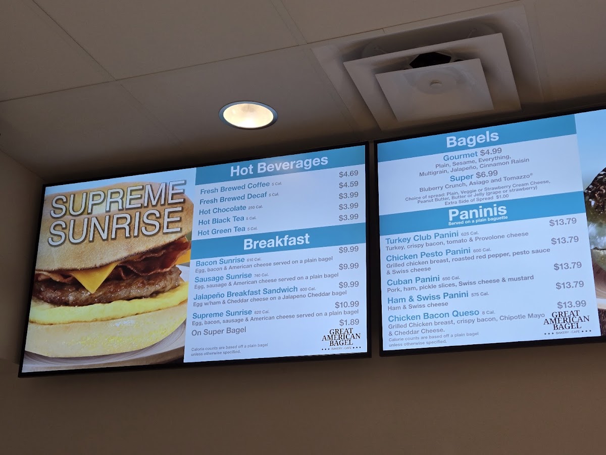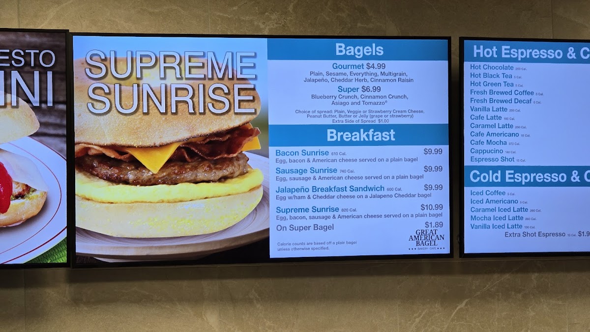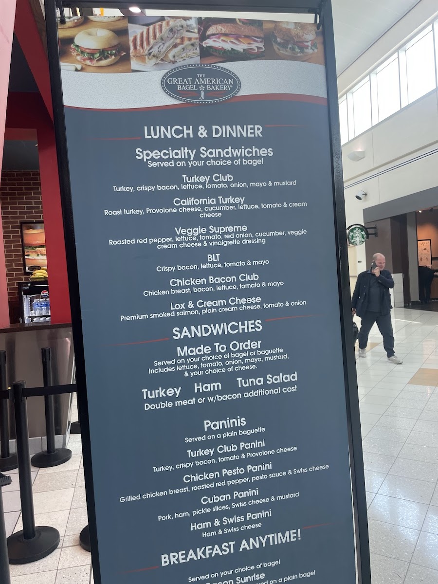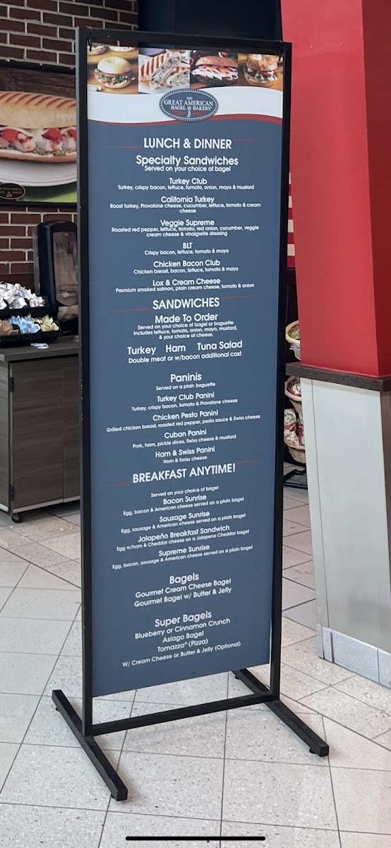 The Great American Bagel Bakery offers a diverse and satisfying menu, perfect for any time of day. Their specialty sandwiches include the Turkey Club, California Turkey, Veggie Supreme BLT, and Chicken Bacon Club, each packed with fresh ingredients and bold flavors. For those who enjoy hot, pressed sandwiches, the paninis such as the Turkey Club Panini, Chicken Pesto Panini, Cuban Panini, and Ham & Swiss Panini are a must-try. If you're in the mood for breakfast, the Bacon Sunrise, Sausage Sunrise, Jalapeño Breakfast Sandwich, and Supreme Sunrise are all available all day long, offering a delicious start to your day. The bagel selection is equally enticing, featuring the Gourmet Cream Cheese Bagel and Gourmet Bagel with Butter & Jelly, as well as the Asiago Bagel and Tomazzo for something a bit more unique. For those looking for a simple, yet satisfying option, there are also choices like Turkey, Ham, and Tuna Salad. Whether you're grabbing a quick bite or sitting down for a hearty meal, The Great American Bagel Bakery ensures there's something for everyone to enjoy.