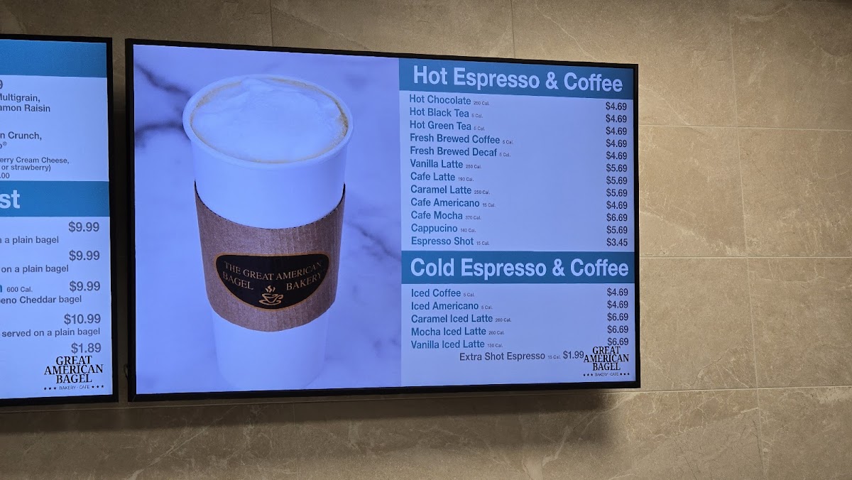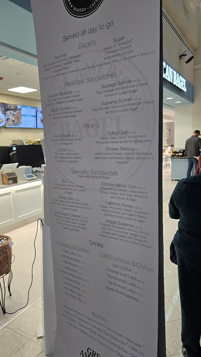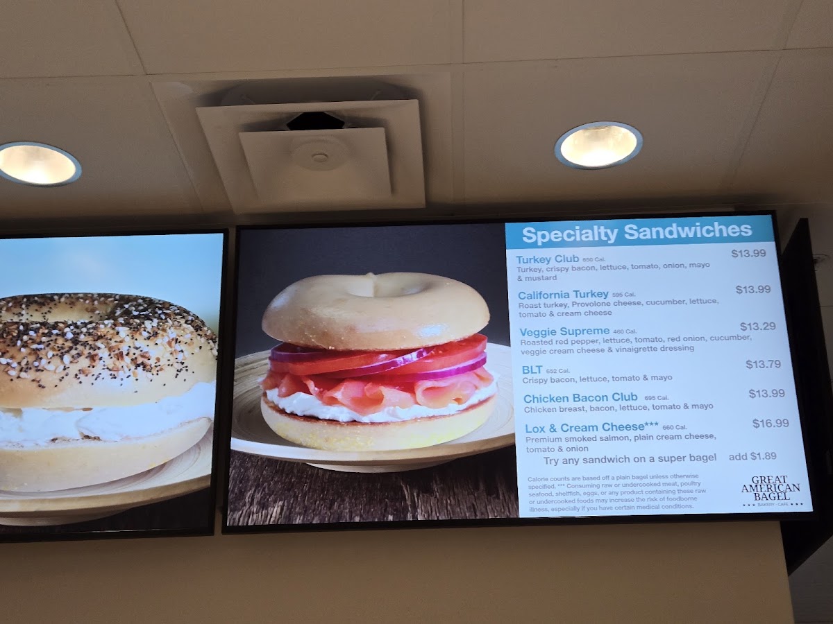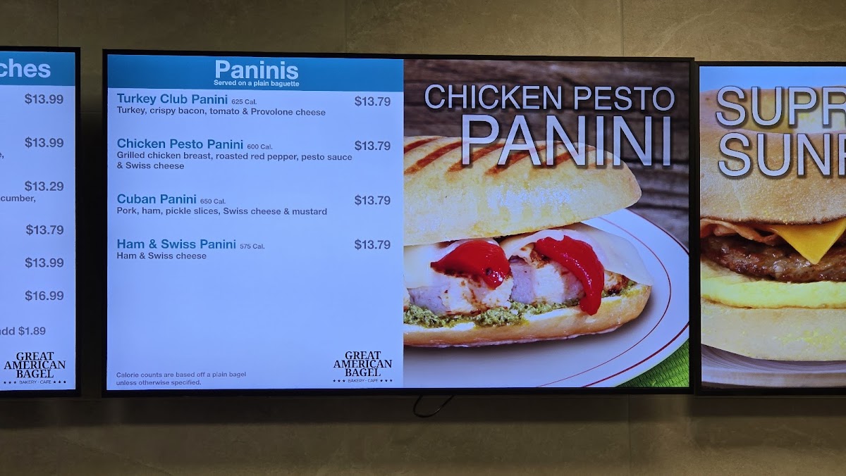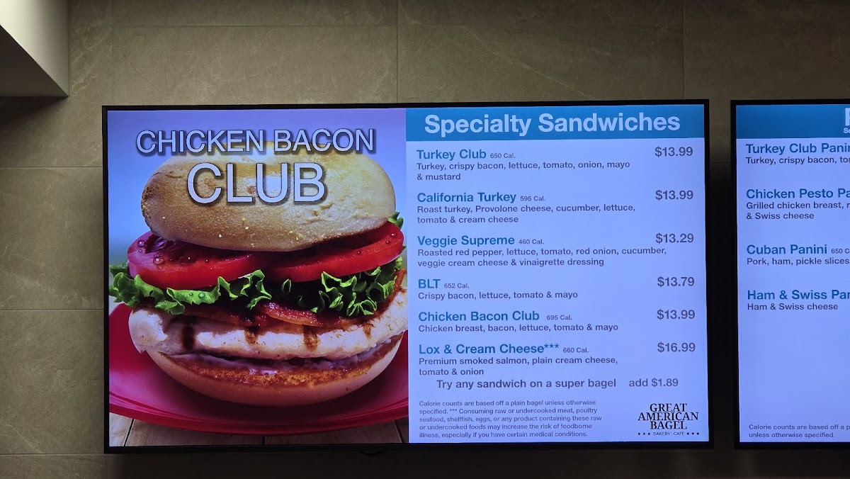 The Great American Bagel Bakery offers a diverse and satisfying menu, perfect for any time of day. Their specialty sandwiches include the Turkey Club, California Turkey, Veggie Supreme BLT, and Chicken Bacon Club, each packed with fresh ingredients and bold flavors. For those who enjoy hot, pressed sandwiches, the paninis such as the Turkey Club Panini, Chicken Pesto Panini, Cuban Panini, and Ham & Swiss Panini are a must-try. If you're in the mood for breakfast, the Bacon Sunrise, Sausage Sunrise, Jalapeño Breakfast Sandwich, and Supreme Sunrise are all available all day long, offering a delicious start to your day. The bagel selection is equally enticing, featuring the Gourmet Cream Cheese Bagel and Gourmet Bagel with Butter & Jelly, as well as the Asiago Bagel and Tomazzo for something a bit more unique. For those looking for a simple, yet satisfying option, there are also choices like Turkey, Ham, and Tuna Salad. Whether you're grabbing a quick bite or sitting down for a hearty meal, The Great American Bagel Bakery ensures there's something for everyone to enjoy.